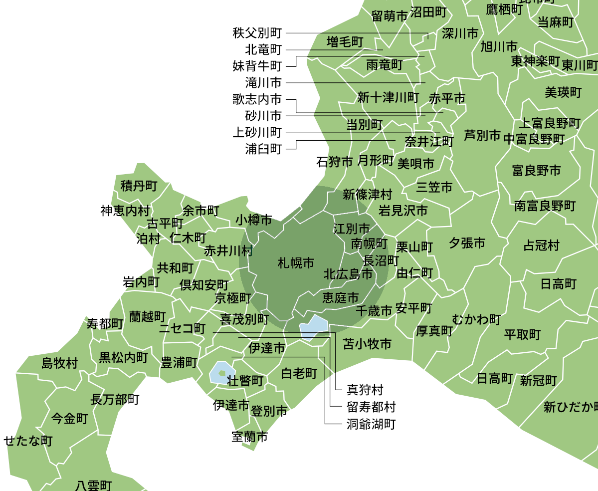 江別市、北広島市、石狩市、小樽市、恵庭市、千歳市、岩見沢市、当別町、長沼町、栗山町、三笠市、美唄市、滝川市 など