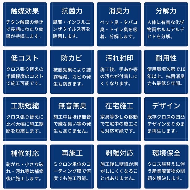 マジカルウォールは抗菌・消臭・防カビはもちろんのこと、チタン触媒の働きで長期にわたり効果が持続します。